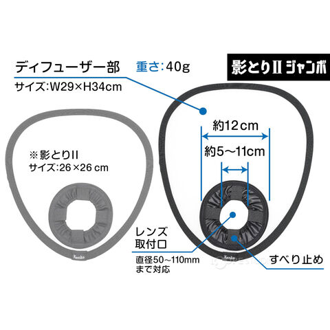 - Kenkoストロボディフューザー「影とりIIジャンボ」はレンズ前面に取り付けて光を拡散し、柔らかい照明を作れます。室内での物撮り、ポートレート撮影などで効果を発揮します。