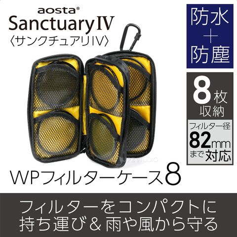 防水生地のTPUやYKK製防水ファスナーを採用。またロック付きカラビナや、ベルトループ、三脚取り付けフラップを装備した3WAYタイプで、82mmのフィルターを8枚収納することが可能。