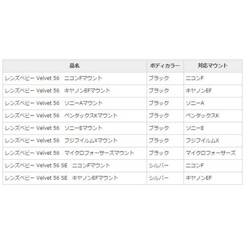 | セット内容 | Velvet 56、メタルフロントキャップ、リアキャップ、ユーザーガイド ※ソニーE用、富士フイルムX用、マイクロフォーサーズ用にのみ専用フードが付属 |