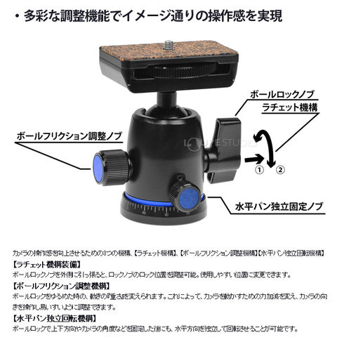 同等サイズの自由雲台を徹底研究。より高い固定力と、多彩な調整機能を兼ね備えた新しい自由雲台です。特にパン独立回転部の精度を高め、ロック時の「画面のズレ」をなくしました。パイプ径20mm-28mmの小型から中型の三脚に。