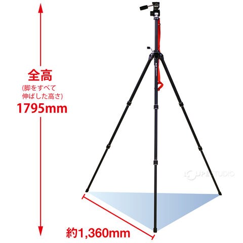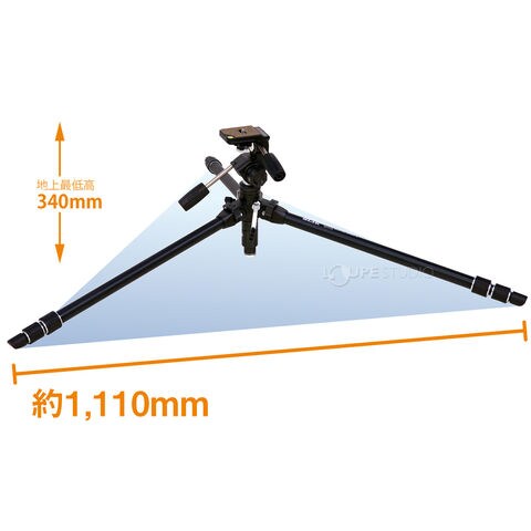 操作性に優れた2ハンドル3ウェイ雲台を装備。 3段階開脚機構により、ハイポジションから ローポジションまで対応する中型アルミ三脚。