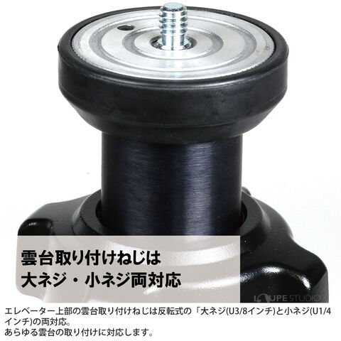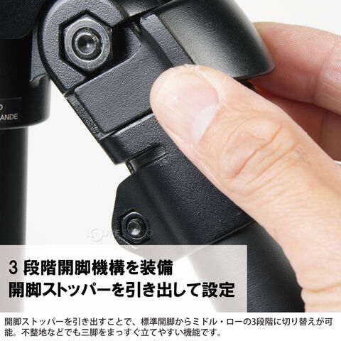 脚ロックはハウジング部にアルミダイカストを採用した、プロ仕様のレバー式脚ロックを採用。3段階開脚機構と分割式エレベーターにより、地上最低高395mmを実現。雲台は2ハンドル3ウェイの「SH-837雲台」(セット販売専用雲台)とすることで、従来のモデルよりも価格を抑えています。