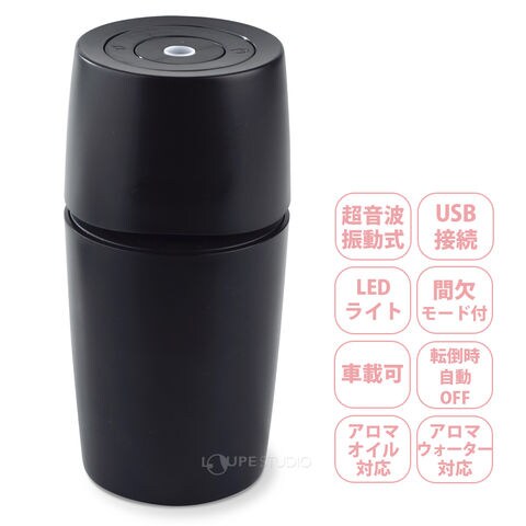 USB接続方式のコンパクトなアロマディフューザー。オフィスや寝室、車内などのパーソナルな空間にオススメです。アロマオイルは水タンクに直接たらすだけ!持ち運びに便利な小さめサイズながらしっかりと香りを広げます。