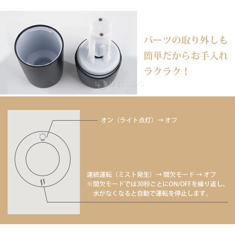 | その他 | ※LEDライト内蔵 ※給電用USB電源接続ケーブル付 ※一部のアロマオイル、アロマウォーターには対応しておりません。 |