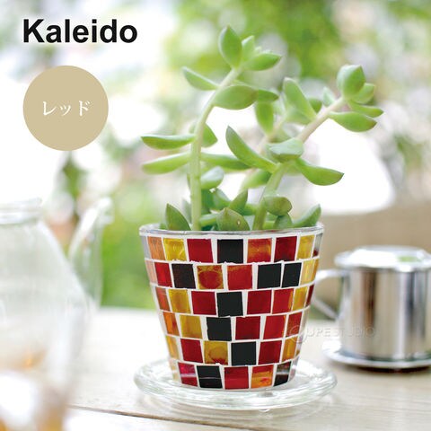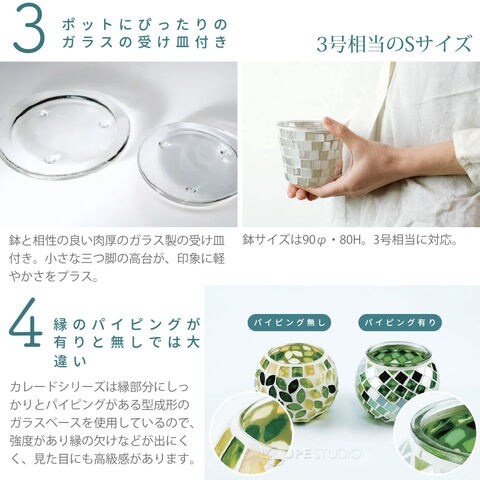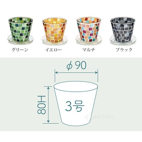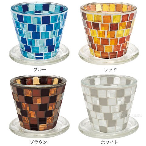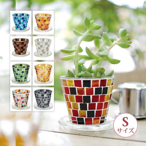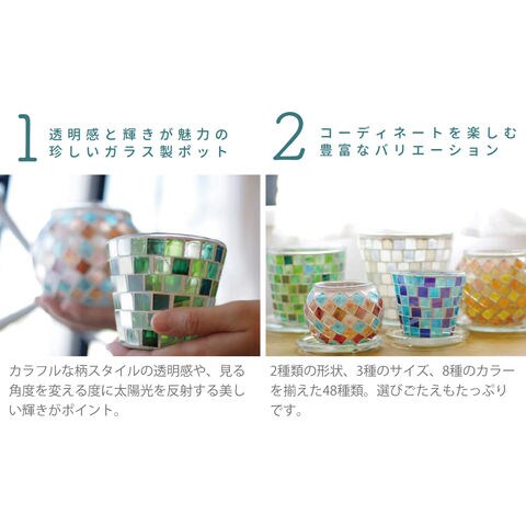 職人手作りのモザイクガラスがキラキラ輝く、受け皿付きのプラントポット。大小選べるサイズと形で並べて飾っても絵になります。鉢底には便利な水抜き穴がついています。