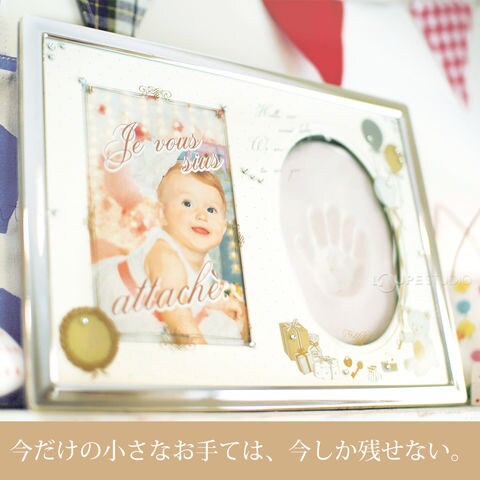 赤ちゃんの手型と大切な写真を一緒に飾ることができます。ガラスにプリントされた淡いカラーのイラストとキラキラ光るラインストーンがとても優しく上品な雰囲気に。赤ちゃんの性別を問わず使えるゴールドとシルバーを基調にした色づかいが嬉しい、とっておきの手型フォトフレームです。