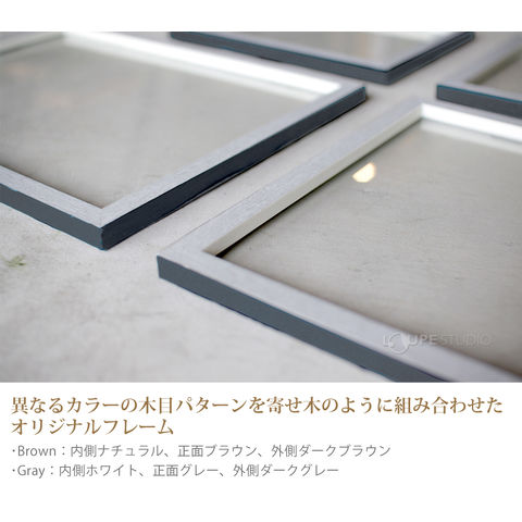 - 3色の木目パターンを寄せ木のように組み合わせたオリジナルフレームです。