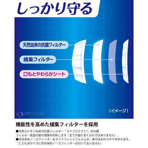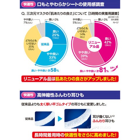 | 特長 | つけ心地の良いふんわり耳ひもを採用 肌ざわりやわらかな高品質不織布を使用 メガネのくもりをブロック |