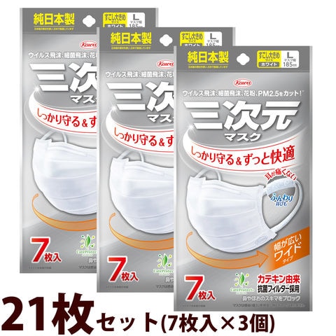 三次元マスク すこし大きめLサイズ ホワイト 21枚セット[7枚入×3個] 不織布 日本製 使い捨て サージカルマスク 耳が痛くない