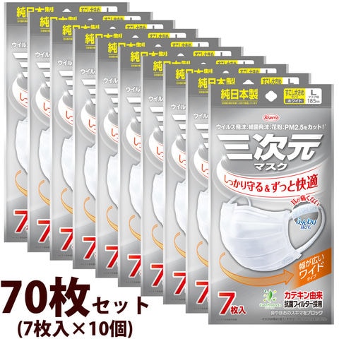 三次元マスク すこし大きめLサイズ ホワイト 70枚セット[7枚入×10個] 不織布 日本製 使い捨て サージカルマスク 耳が痛くない
