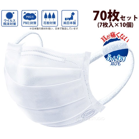 三次元マスク すこし大きめLサイズ ホワイト 70枚セット[7枚入×10個] 不織布 日本製 使い捨て サージカルマスク 耳が痛くないスペック