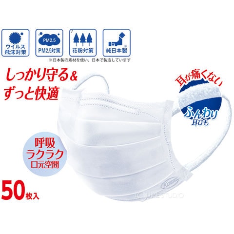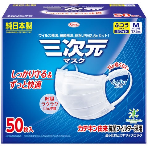 三次元マスク ふつうMサイズ ホワイト 50枚 不織布 日本製 使い捨て サージカルマスク 耳が痛くないスペック