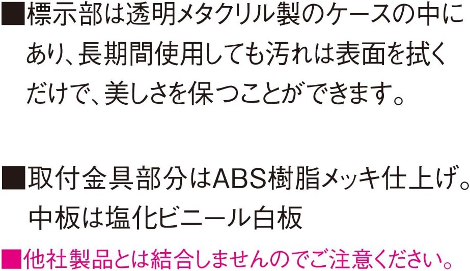 - 標示部は透明メタクリル製のケースの中にあり、長期間使用しても汚れは表面を拭くだけで、美しさを保つことができます。