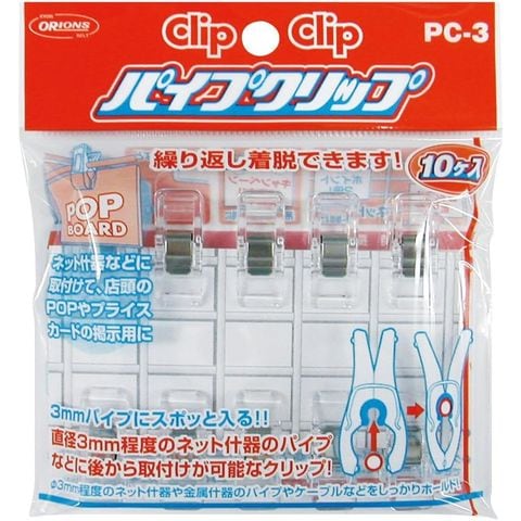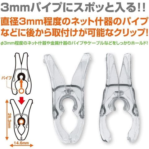 - 直径3mm程度のネット什器のパイプなどに後から取付けが可能なクリップ