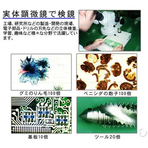 基盤・電子部品・ドリルの刃先や植物・動物等の試料(ワーク)を何の加工もなしに、顕微鏡下に置くだけで、正立像で観察できます。 また様々な試料(ワーク)に対応できる照明装置付スタンドもご用意しています。