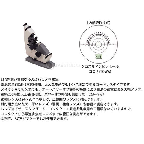 LED光源が電球交換の煩わしさを解消。電源に単3電池(2本)を使用、どんな場所でもレンズ測定できるコードレスタイプです。スイッチを切り忘れても、オートパワーオフ機能の搭載により電池の節電効果を大幅アップ。連続200時間以上使用可能。パワーオフ時間も調整可能(2分~9分)被検レンズ径24~90mmΦまで、広範囲のレンズに対応できます。軸打隔が広いため、厚いレンズ(弱視・強度レンズ)も容易に測定できます。レンズ当てが、スタンダード・コンタクト・累進多焦点用の三種類付いていますので、コンタクトから累進多焦点レンズまで広範囲測定ができます。