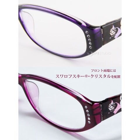 透けるような優しいパープルフレームにカワイイネコ、顔色を良く見せるボルドーに隠れネコ。フロント両端にはスワロフスキーR・クリスタルを配置。お顔を明るく若々しくさせ、ご使用場面に華を添えます。