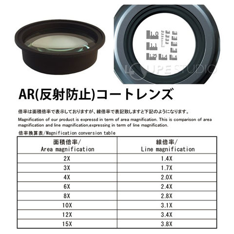- 上図の例のように、面積倍率が2倍ということは、1平方センチメートルのものが面積倍率2倍のレンズを通してみると、2平方センチメートルと もとの面積の2倍に見えるということです。