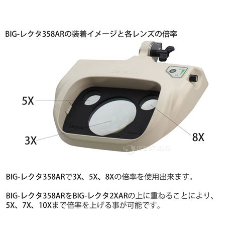 人の視野に近い角形の大型レンズを採用(2XAR、4XAR)。さらにレンズの表面には反射防止コートを標準装備。倍率は2倍、4倍そして3倍、5倍、8倍を組み合わせた358ARを用意し交換レンズ方式になっております。