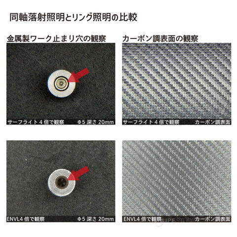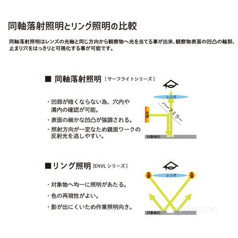 - 同軸照明はレンズの光軸と同じ方向から観察物へ光を当てることができ、観察物の凸凹を可視化することができます。