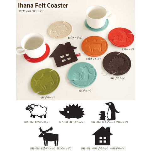 動物の柄のエンボス(型押し)入りや、楽しい形に抜いた暖かい雰囲気のコースターです。ウォッシャブルフェルトなので汚れても手洗いができ、衛生的です。/※家の形のIHA-110 HBR(ブラウン)、HGR(グリーン)は廃盤になりました。