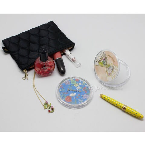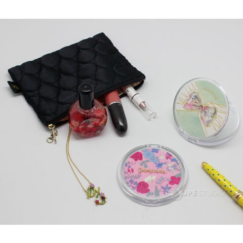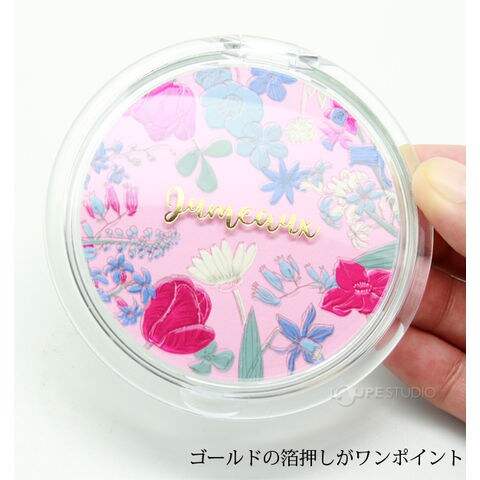 クリアケースにキュートな柄が入ったコンパクトミラー。非常に軽いので持ち運びが簡単で、かさばらないのでポーチにもすっきり収まります。イラストにはゴールドの箔押しが入っており、可愛さと高級感を演出しています。普段使いはもちろん、プチギフトとしてもオススメです。