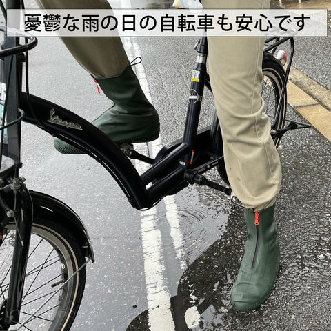 雨の中自転車に乗ると、傘をさしても靴やズボンが濡れてしまいがちですが、こちらのカバーがあれば、ズボンの裾をINしてしっかりカバーできます。