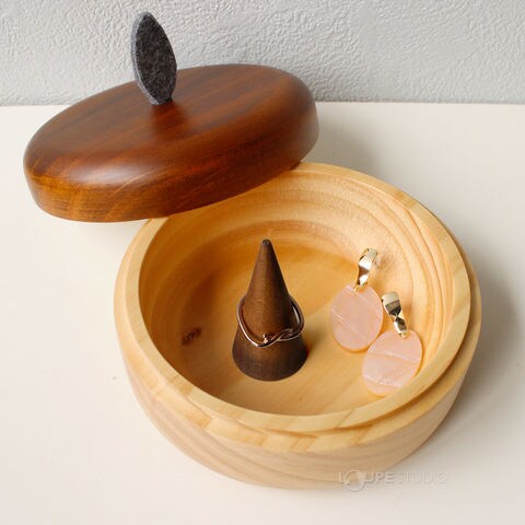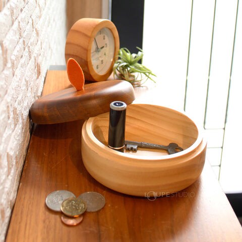 丸みのある形をした無垢の天然木で、つまみは温もりを感じられるフェルト素材。どのお部屋にもしっくり馴染みます。カギやハンコを入れて、玄関にスタンバイしても可愛い!!