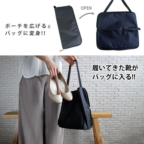 かかとの太ゴムで締め付け感なく優しく足にフィットするので、歩き易くて快適な履き心地。履いてきた靴を収納できるトートにもなる収納ポーチ付=学校行事用スリッパ・オフィスの替え靴・習い事用スリッパ・冠婚葬祭の替え靴として大活躍!コーデし易いシックな三色展開。