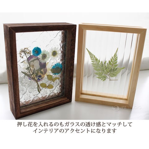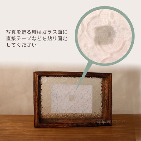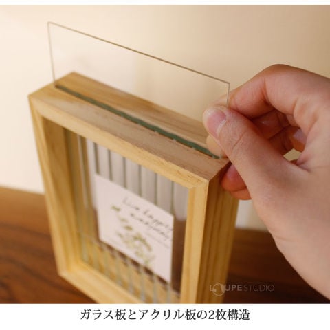 ガラス板とアクリル板の2枚構造になっているので、板の間に挟む形で写真・押し花・ファブリックなどをお飾り下さい。 アクリル板のみ取り外し可能です。(上部からアクリル板が出てきます。)