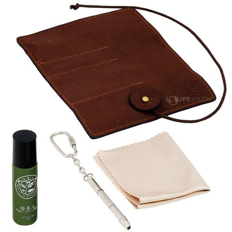 オーガニックレンズクリーナー「Q.E.L」が入ったセット品。携帯に便利なロールケース付。ノベルティにも最適。