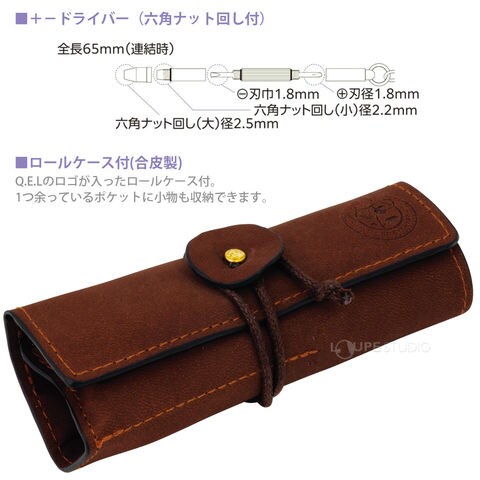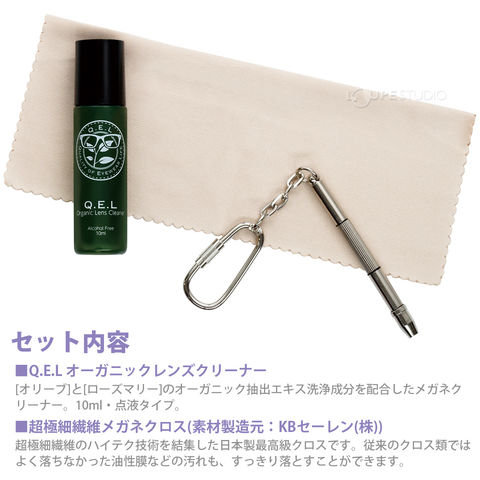 | セット内容 | Q.E.L オーガニックレンズクリーナーミニ、超極細繊維メガネクロス(12×15cm)、+-ドライバー(六角ナット回し付)、ロールケース(合皮) |