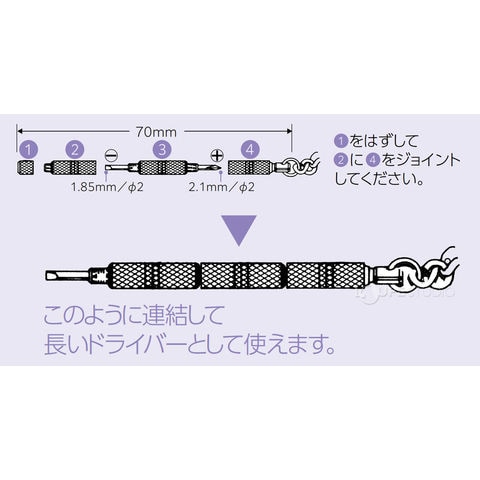 プラス、マイナス、連結して長いドライバーとして使えます。