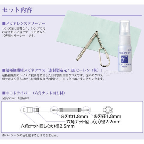 | セット内容 | メガネレンズクリーナー、超極細繊維メガネクロス、+-ドライバー(六角ナット回し付) |