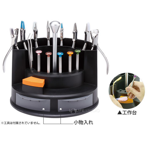 使い勝手の良い工作台と、小物入れを一体化した優れ物の工具スタンドです。