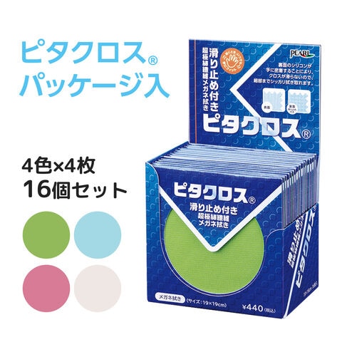 メガネ拭き 眼鏡拭き めがね拭き クロス クリーニング メガネクロス スマホ拭き 液晶 携帯 お手入れ ピタクロス パッケージ入 滑り止め付き 超極細繊維 4色各4枚 16個セット