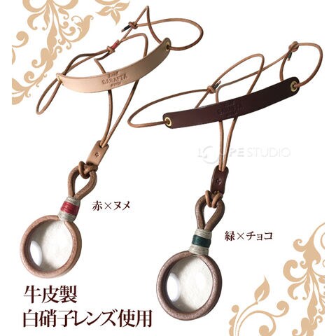 品質の良い白硝子を使ったレンズを牛革でつつみこんだ、やさしい虫眼鏡。革紐を通しておしゃれな雰囲気に仕上げました。
