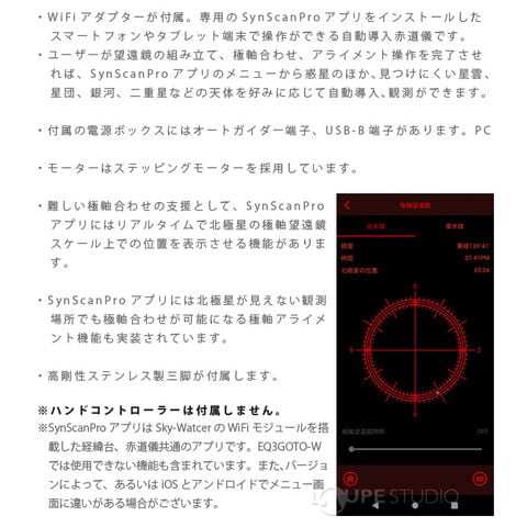 | 付属品 | 極軸望遠鏡、ハンドコントローラー(※WiFiアダプターは付属しません。) |