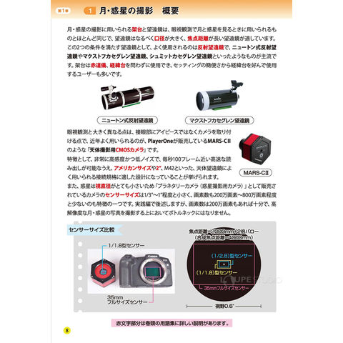 - 天体用 CMOS カメラを使った月や惑星の撮影にはじめて挑戦する人のために、「準備編」「実践編」「処理編」に分けて、手順やノウハウをフルカラー68 ページの大ボリュームでわかりやすく解説しています。