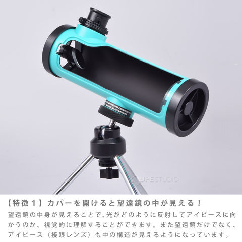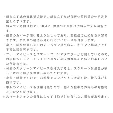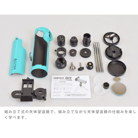 「NEWTONY DIY」は組み立て式の天体望遠鏡で、組み立てながら天体望遠鏡の仕組みを楽しく学べる工作キットです。組み立て時間はおよそ30分で、付属の工具だけで組み立てが可能です。完成後には、天体望遠鏡側面のカバーを開けて望遠鏡の内部が見られるようになっています。付属の10mmアイピース使用で倍率は20倍となり、月面のクレーターや木星のガリレオ衛星などが観測できます。市販のアイピースも使用可能ですので、倍率を変えてお好みの対象をご覧いただくことも可能です。またスマートフォンアダプターが付属しているので、月の写真などを手軽に撮影することができます。「NEWTONY DIY」で庭先やベランダ、キャンプ場などで気軽に天体観測をお楽しみください。夏休みの工作や自由研究にもぴったりの商品です。