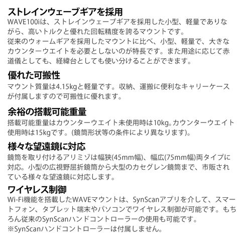 スカイウォッチャー 天体望遠鏡 Sky-Watcher WAVE100i ストレインウェーブ・ギア 赤道儀/経緯台両用 日本語マニュアル付き 赤道儀モード 経緯台モード 望遠鏡 マウント 軽量 小型 Wi-Fi機能 ワイヤレス制御スペック