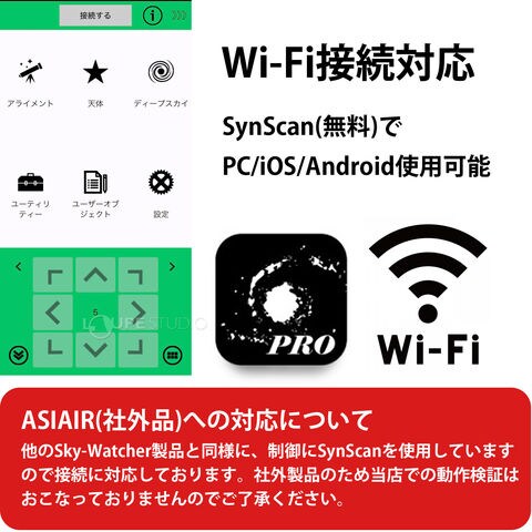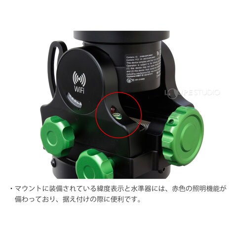 | 付属品 | USB TypeA-Bケーブル(150mm)、DCシガーソケットタイプ電源ケーブル、セカンダリーアリミゾ、工具、キャリーケース、日本語マニュアル ※三脚、ハーフピラー、カウンターウエイト、ウエイトシャフトはオプションです。 |