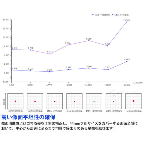 - 日本製SDガラス1枚を含む4枚構成の光学系を採用し、色収差を効果的に軽減。像面湾曲 およびコマ収差を丁寧に補正し、F3.9 の明るさながら、φ44mmフルサイズをカバーし、画面全域において均質な星像を結びます。