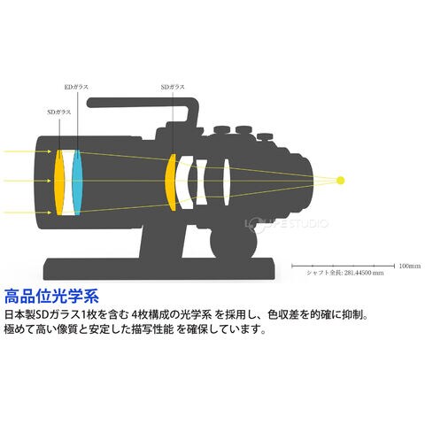 | 光学構成 | 4群4枚構成(うち1枚に日本製SD(特殊低分散)ガラスを採用) |