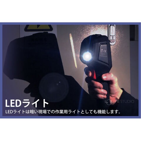 - 設定した温度以上になると、内蔵スピーカーとLEDフラッシュライトでオペレータにアラームを通知することができます。LEDライトは暗い現場での作業用ライトとしても機能します。