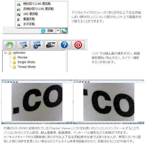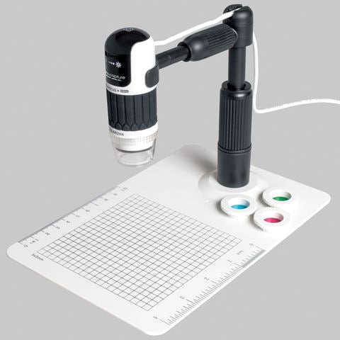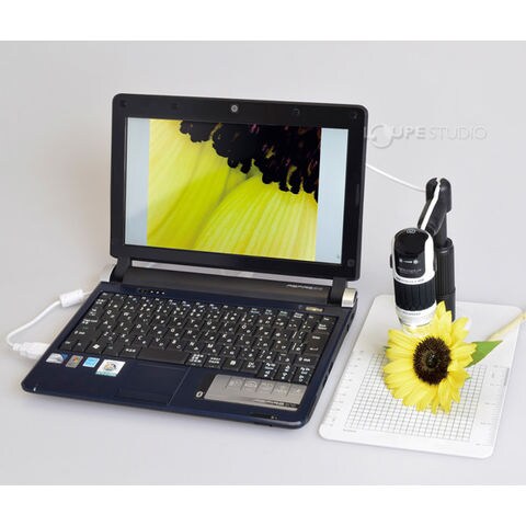 パソコンへUSB接続をすることでリアルタイムに拡大された映像を映し出し、静止画・動画の保存も可能。さらにPLフィルター内蔵の上、微動操作のできるスタンド、カラーフィルターも付属し従来品よりもパワーアップしたデジタルマイクロスコープです。
