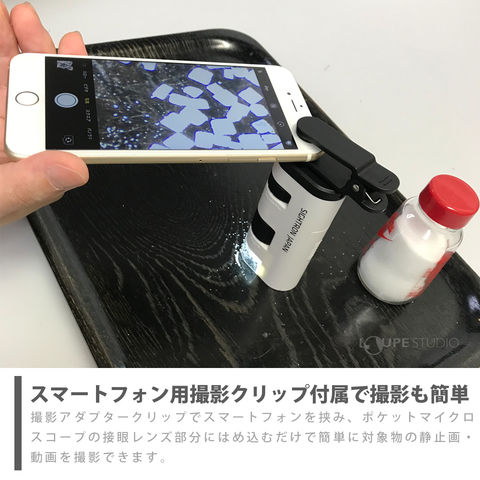 20倍から60倍へズームアップできるコンパクト顕微鏡。LEDライトを装備しているので、日中はもちろん夜間や暗い場所でも観察ができます。簡単に取り付けが可能なスマートフォン用の撮影クリップが付属。スマホで静止画や動画を撮影して後で比較したり、ゆっくりと観察したり、データ保存にも最適です。キャンプや旅行先で植物や昆虫の観察、ペットのノミ、絨毯のダニのチェック、皮膚や頭皮の状態確認、鉱石や宝石などの鑑定など、様々な対象物を観察していただけます。大きさは手のひらサイズでポケットに入れても邪魔にならないサイズ。重さも約卵1個分なので、小さなお子様でも簡単に持ち運びができます。
