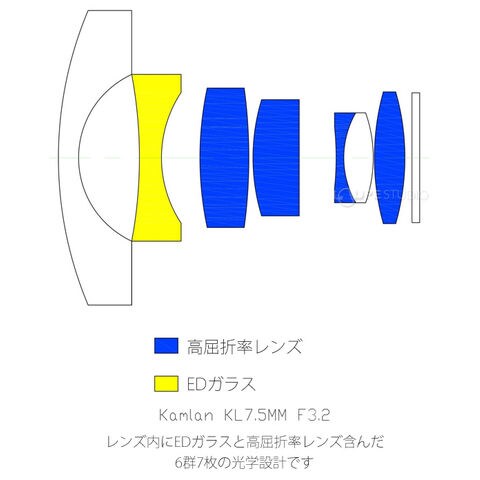 - レンズ内にEDガラスと高屈折率レンズ含んだ6群7枚の光学設計です。