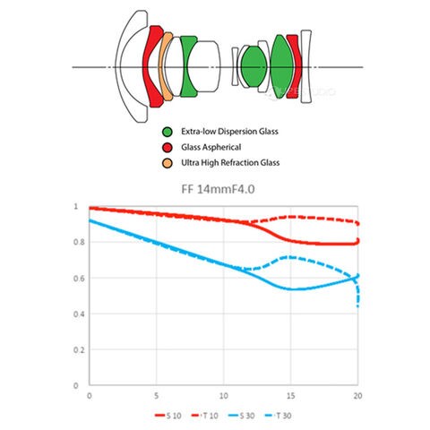 - 2枚の非球面レンズと3枚の特殊低分散(ED)レンズの採用により、画面の隅々までディストーションを極めて少なく補正します。さらに、色収差を最小限に抑制します。