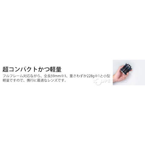 - フルフレーム対応ながら、全長59mm※1、重さわずか228g※1と小型軽量ですので、携行に最適なレンズです。
